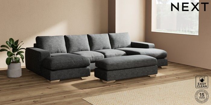 7.2.6 Buy Houghton Deep Relaxed Sit Large - U Shaped Double Chaise with Footstool Boucle Weave Easy Clean Charcoal Grey Large Square Angle - Chrome Metal from the Next UK online shop Click here to use our accessible website
