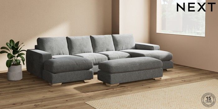 7.2.6 Buy Houghton Deep Relaxed Sit Large - U Shaped Double Chaise with Footstool Chunky Chenille Dark Grey Large Square Angle - Chrome Metal from the Next UK online shop Click here to use our accessible website