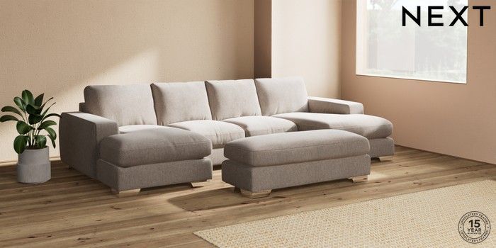 7.2.6 Buy Houghton Deep Relaxed Sit Large - U Shaped Double Chaise with Footstool Chunky Chenille Light Dove Large Square Angle - Chrome Metal from the Next UK online shop Click here to use our accessible website