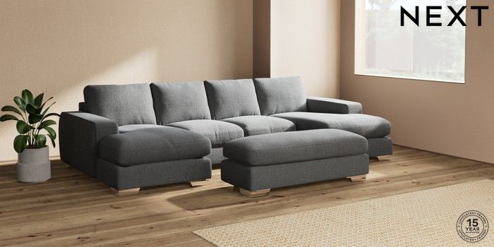 7.2.6 Buy Houghton Deep Relaxed Sit Large - U Shaped Double Chaise with Footstool Chunky Texture Dark Grey Large Square Angle - Chrome Metal from the Next UK online shop Click here to use our accessible website