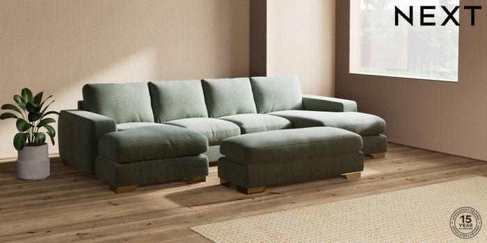 7.2.6 Buy Houghton Deep Relaxed Sit Large - U Shaped Double Chaise with Footstool Chunky Texture Mid Forest Green Large Square Angle - Brushed Brass from the Next UK online shop Click here to use our accessible website