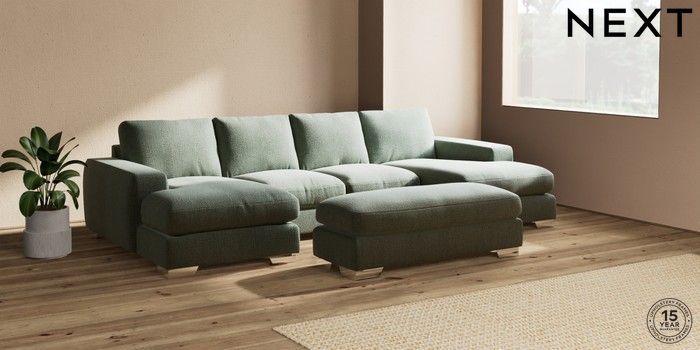 7.2.6 Buy Houghton Deep Relaxed Sit Large - U Shaped Double Chaise with Footstool Chunky Texture Mid Forest Green Large Square Angle - Chrome Metal from the Next UK online shop Click here to use our accessible website