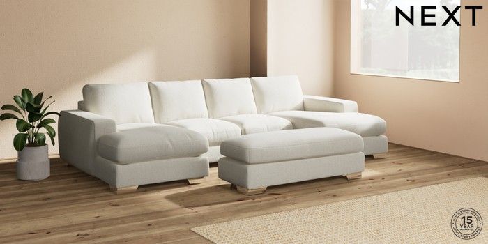7.2.6 Buy Houghton Deep Relaxed Sit Large - U Shaped Double Chaise with Footstool Chunky Texture Oyster Large Square Angle - Chrome Metal from the Next UK online shop Click here to use our accessible website