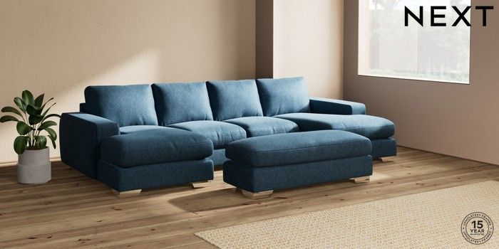 7.2.6 Buy Houghton Deep Relaxed Sit Large - U Shaped Double Chaise with Footstool Cotswold Chenille Dark Blue Large Square Angle - Chrome Metal from the Next UK online shop Click here to use our accessible website