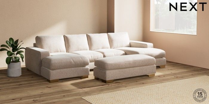 7.2.6 Buy Houghton Deep Relaxed Sit Large - U Shaped Double Chaise with Footstool Cotswold Chenille Light Natural Large Square Angle - Brushed Brass from the Next UK online shop Click here to use our accessible website