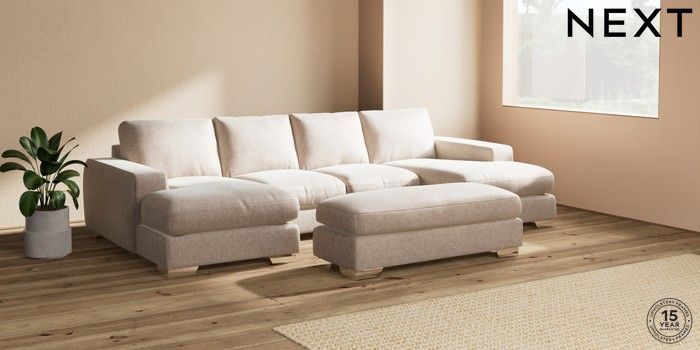 7.2.6 Buy Houghton Deep Relaxed Sit Large - U Shaped Double Chaise with Footstool Cotswold Chenille Light Natural Large Square Angle - Chrome Metal from the Next UK online shop Click here to use our accessible website