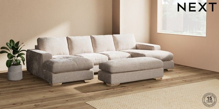 7.2.6 Buy Houghton Deep Relaxed Sit Large - U Shaped Double Chaise with Footstool Distressed Velour Mid Natural Large Square Angle - Chrome Metal from the Next UK online shop Click here to use our accessible website