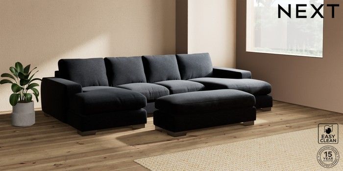7.2.6 Buy Houghton Deep Relaxed Sit Large - U Shaped Double Chaise with Footstool Fine Chenille Easy Clean Black Large Square Angle - Gunmetal from the Next UK online shop Click here to use our accessible website