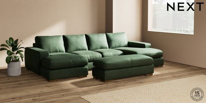 7.2.6 Buy Houghton Deep Relaxed Sit Large - U Shaped Double Chaise with Footstool Luxe Chenille Dark Green Large Square Angle - Mid from the Next UK online shop Click here to use our accessible website