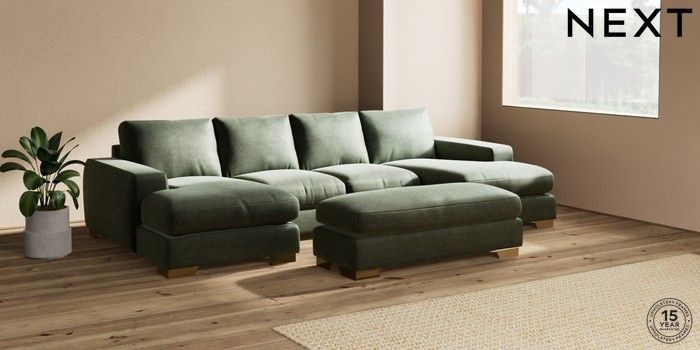 7.2.6 Buy Houghton Deep Relaxed Sit Large - U Shaped Double Chaise with Footstool Luxe Chenille Mid Green Large Square Angle - Brushed Brass from the Next UK online shop Click here to use our accessible website