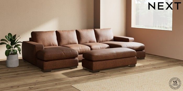 7.2.6 Buy Houghton Deep Relaxed Sit Large - U Shaped Double Chaise with Footstool Monza Faux Leather Easy Clean Chestnut Brown Large Square Angle - Gunmetal from the Next UK online shop Click here to use our accessible website
