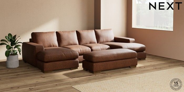 7.2.6 Buy Houghton Deep Relaxed Sit Large - U Shaped Double Chaise with Footstool Monza Faux Leather Easy Clean Chestnut Brown Large Square Angle - Mid from the Next UK online shop Click here to use our accessible website