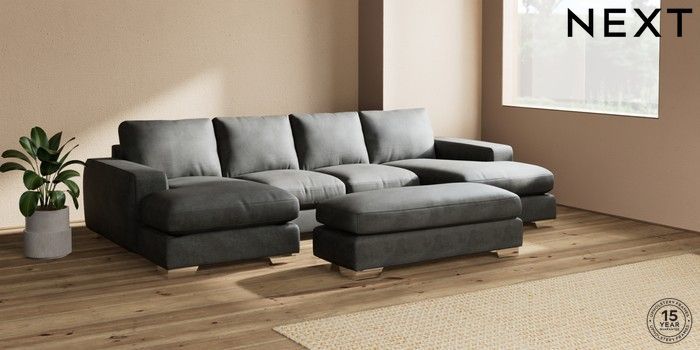 7.2.6 Buy Houghton Deep Relaxed Sit Large - U Shaped Double Chaise with Footstool Monza Faux Leather Easy Clean Dark Grey Large Square Angle - Chrome Metal from the Next UK online shop Click here to use our accessible website