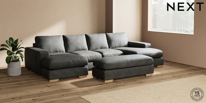 7.2.6 Buy Houghton Deep Relaxed Sit Large - U Shaped Double Chaise with Footstool Monza Faux Leather Easy Clean Dark Grey Large Square Angle - Light from the Next UK online shop Click here to use our accessible website