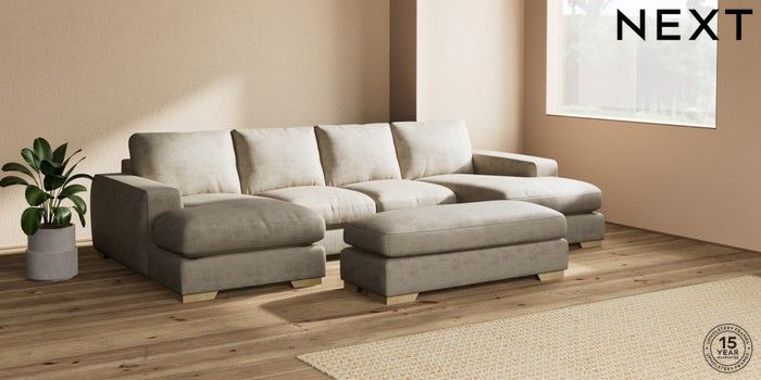 7.2.6 Buy Houghton Deep Relaxed Sit Large - U Shaped Double Chaise with Footstool Monza Faux Leather Easy Clean Mink Brown Large Square Angle - Light from the Next UK online shop Click here to use our accessible website