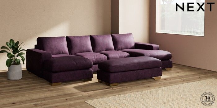 7.2.6 Buy Houghton Deep Relaxed Sit Large - U Shaped Double Chaise with Footstool Plush Chenille Dark Plum Purple Large Square Angle - Brushed Brass from the Next UK online shop Click here to use our accessible website