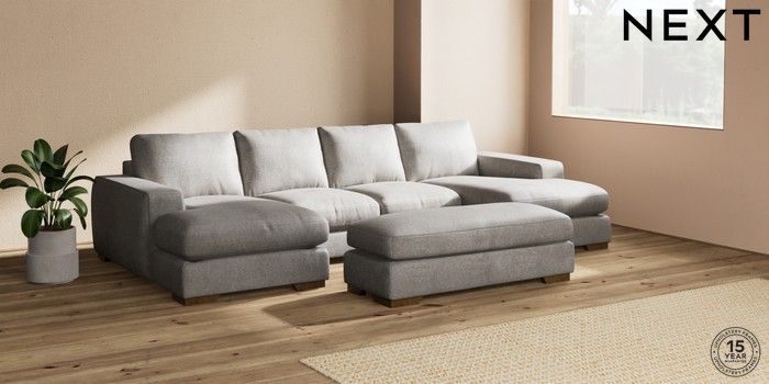 7.2.6 Buy Houghton Deep Relaxed Sit Large - U Shaped Double Chaise with Footstool Plush Chenille Light Grey Large Square Angle - Mid from the Next UK online shop Click here to use our accessible website