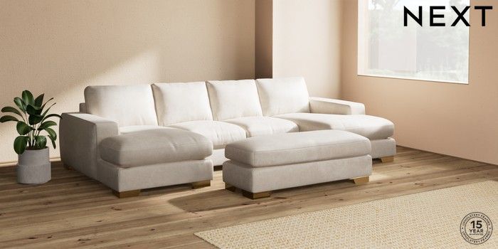 7.2.6 Buy Houghton Deep Relaxed Sit Large - U Shaped Double Chaise with Footstool Plush Chenille Oyster Large Square Angle - Brushed Brass from the Next UK online shop Click here to use our accessible website