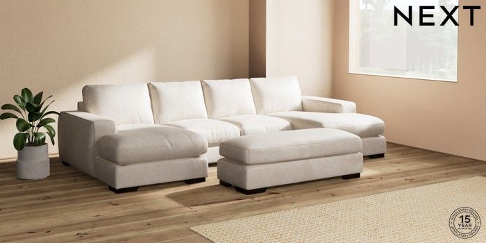 7.2.6 Buy Houghton Deep Relaxed Sit Large - U Shaped Double Chaise with Footstool Plush Chenille Oyster Large Square Angle - Dark from the Next UK online shop Click here to use our accessible website