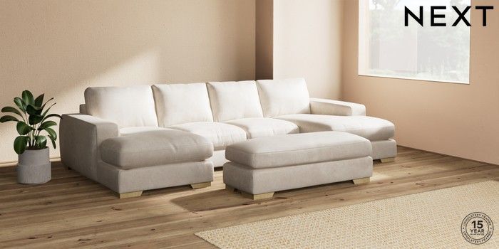 7.2.6 Buy Houghton Deep Relaxed Sit Large - U Shaped Double Chaise with Footstool Plush Chenille Oyster Large Square Angle - Light from the Next UK online shop Click here to use our accessible website