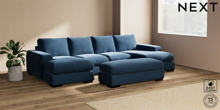 7.2.6 Buy Houghton Deep Relaxed Sit Large - U Shaped Double Chaise with Footstool Plush Velvet Easy Clean Airforce Blue Large Square Angle - Dark from the Next UK online shop Click here to use our accessible website