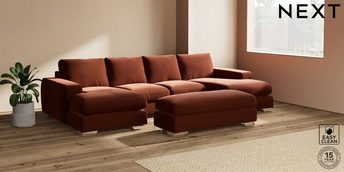 7.2.6 Buy Houghton Deep Relaxed Sit Large - U Shaped Double Chaise with Footstool Plush Velvet Easy Clean Ginger Orange Large Square Angle - Chrome Metal from the Next UK online shop Click here to use our accessible website