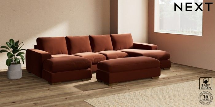 7.2.6 Buy Houghton Deep Relaxed Sit Large - U Shaped Double Chaise with Footstool Plush Velvet Easy Clean Ginger Orange Large Square Angle - Mid from the Next UK online shop Click here to use our accessible website