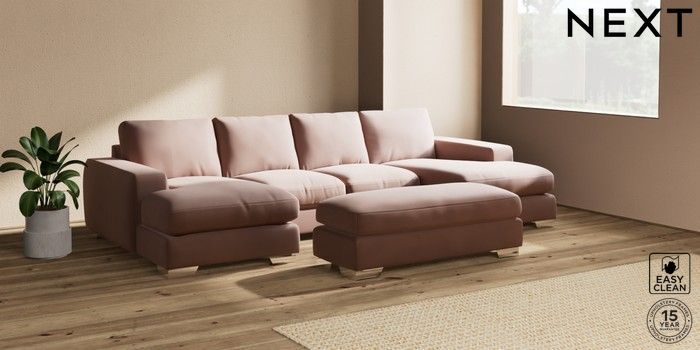 7.2.6 Buy Houghton Deep Relaxed Sit Large - U Shaped Double Chaise with Footstool Plush Velvet Easy Clean Mid Natural Large Square Angle - Chrome Metal from the Next UK online shop Click here to use our accessible website