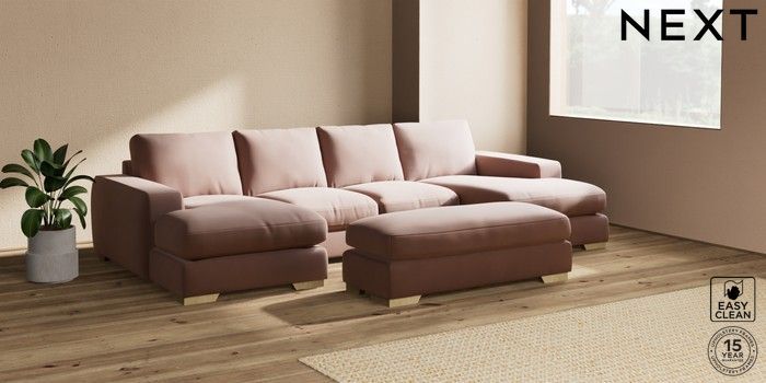 7.2.6 Buy Houghton Deep Relaxed Sit Large - U Shaped Double Chaise with Footstool Plush Velvet Easy Clean Mid Natural Large Square Angle - Light from the Next UK online shop Click here to use our accessible website