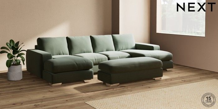 7.2.6 Buy Houghton Deep Relaxed Sit Large - U Shaped Double Chaise with Footstool Relaxed Linen Look Dark Green Large Square Angle - Chrome Metal from the Next UK online shop Click here to use our accessible website