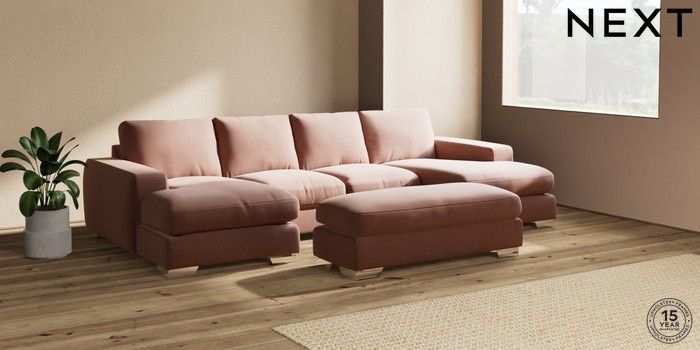 7.2.6 Buy Houghton Deep Relaxed Sit Large - U Shaped Double Chaise with Footstool Relaxed Linen Look Light Rust Brown Large Square Angle - Chrome Metal from the Next UK online shop Click here to use our accessible website