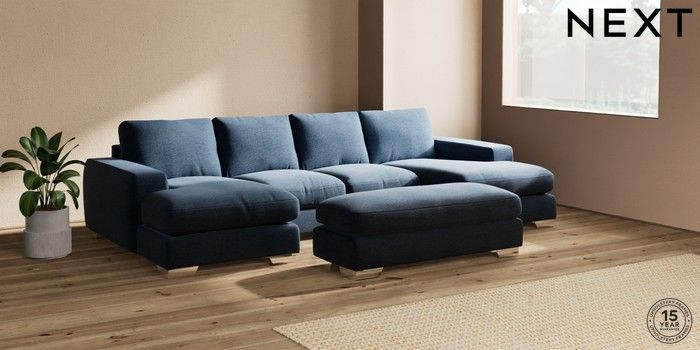 7.2.6 Buy Houghton Deep Relaxed Sit Large - U Shaped Double Chaise with Footstool Ripple Chenille Dark Blue Large Square Angle - Chrome Metal from the Next UK online shop Click here to use our accessible website