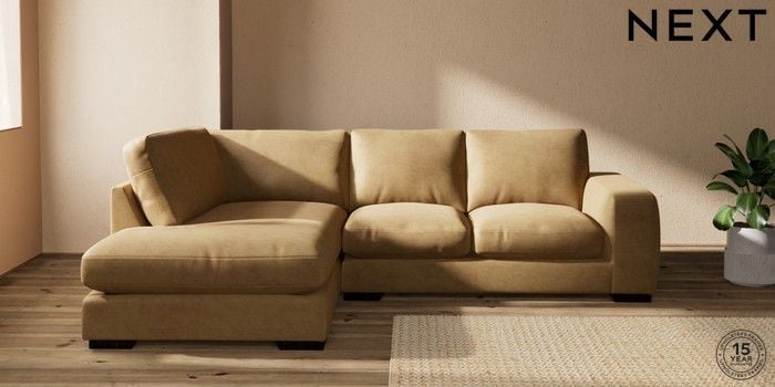 7.0.3 Buy Houghton Deep Relaxed Sit Medium Corner Chaise - Left Hand Luxe Chenille Honey Yellow Large Square Angle - Dark from the Next UK online shop Click here to use our accessible website