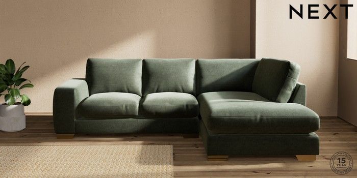 7.0.3 Buy Houghton Deep Relaxed Sit Medium Corner Chaise - Right Hand Luxe Chenille Mid Green Large Square Angle - Brushed Brass from the Next UK online shop Click here to use our accessible website