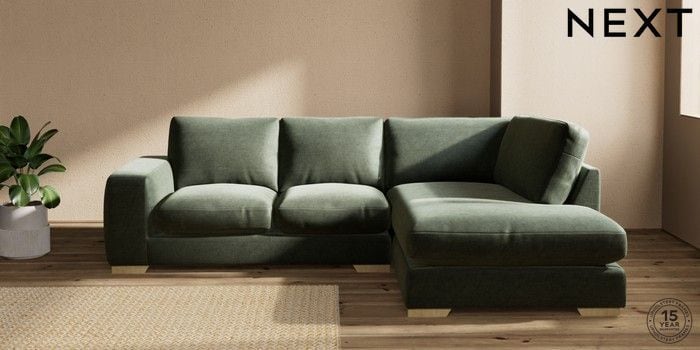 7.0.3 Buy Houghton Deep Relaxed Sit Medium Corner Chaise - Right Hand Luxe Chenille Mid Green Large Square Angle - Light from the Next UK online shop Click here to use our accessible website