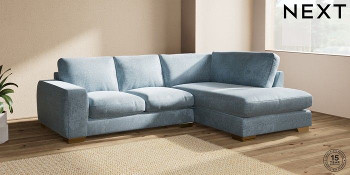 7.2.6 Buy Houghton Deep Relaxed Sit Medium Corner Chaise - Right Hand Plush Chenille Light Blue Large Square Angle - Brushed Brass from the Next UK online shop Click here to use our accessible website