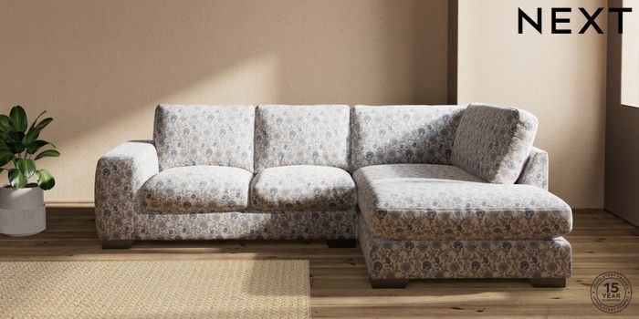 7.3.1 Buy Houghton Deep Relaxed Sit Medium Corner Chaise - Right Hand Relaxed Linen Look Print Woodblock Floral Blue Large Square Angle - Gunmetal from the Next UK online shop Click here to use our accessible website