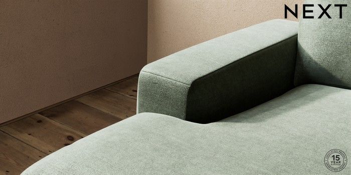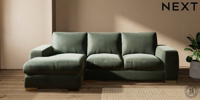 7.0.3 Buy Houghton Deep Relaxed Sit Medium Sofa Chaise - Left Hand Luxe Chenille Mid Green Large Square Angle - Brushed Brass from the Next UK online shop Click here to use our accessible website