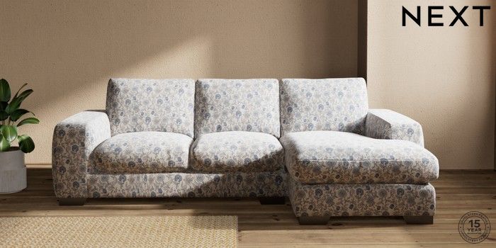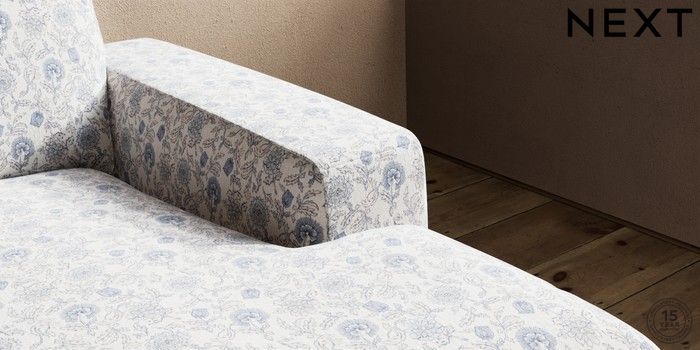 7.3.1 Buy Houghton Deep Relaxed Sit Medium Sofa Chaise - Right Hand Relaxed Linen Look Print Woodblock Floral Blue Large Square Angle - Gunmetal from the Next UK online shop Click here to use our accessible website
