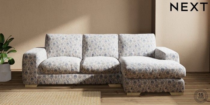 7.3.1 Buy Houghton Deep Relaxed Sit Medium Sofa Chaise - Right Hand Relaxed Linen Look Print Woodblock Floral Blue Large Square Angle - Light from the Next UK online shop Click here to use our accessible website