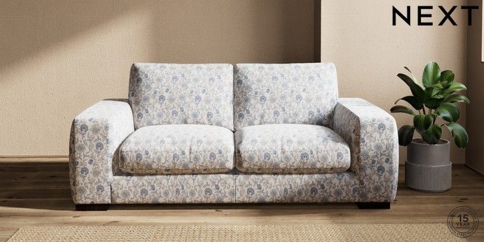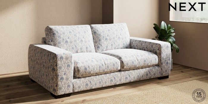 7.3.1 Buy Houghton Deep Relaxed Sit Sofa Bed Relaxed Linen Look Print Woodblock Floral Blue Large Square Angle - Dark from the Next UK online shop Click here to use our accessible website
