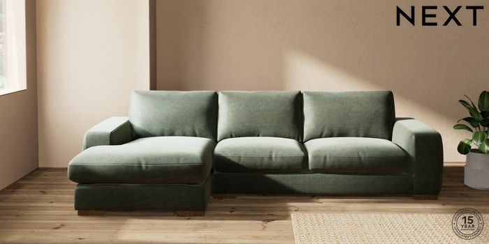 7.0.3 Buy Houghton Deep Relaxed Sit Sofa Chaise Bed - Left Hand Luxe Chenille Mid Green Large Square Angle - Mid from the Next UK online shop Click here to use our accessible website