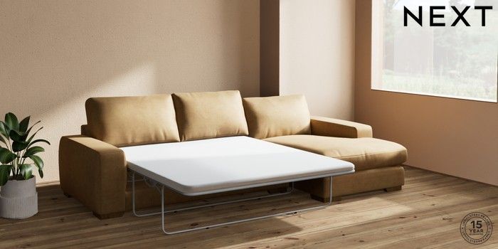 7.0.3 Buy Houghton Deep Relaxed Sit Sofa Chaise Bed - Right Hand Luxe Chenille Honey Yellow Large Square Angle - Mid from the Next UK online shop Click here to use our accessible website
