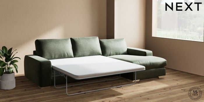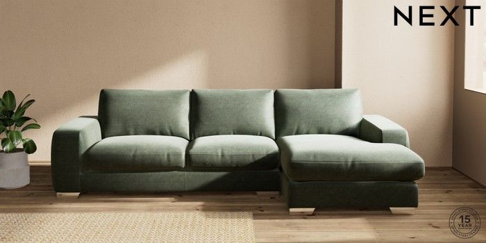7.0.3 Buy Houghton Deep Relaxed Sit Sofa Chaise Bed - Right Hand Luxe Chenille Mid Green Large Square Angle - Chrome Metal from the Next UK online shop Click here to use our accessible website