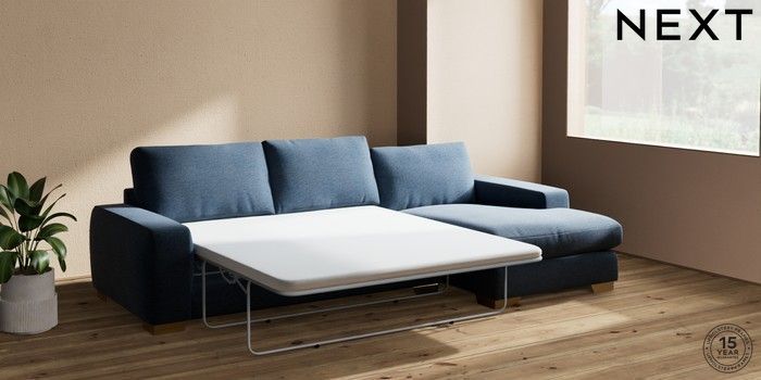 7.0.3 Buy Houghton Deep Relaxed Sit Sofa Chaise Bed - Right Hand Ripple Chenille Dark Blue Large Square Angle - Brushed Brass from the Next UK online shop Click here to use our accessible website