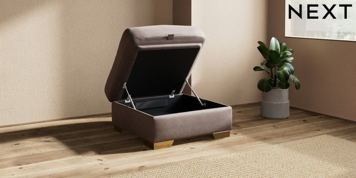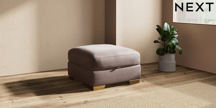 6.12.1 Buy Houghton Deep Relaxed Sit Storage Footstool Luxe Chenille Mink Brown Square Angle - Brushed Brass from the Next UK online shop Click here to use our accessible website