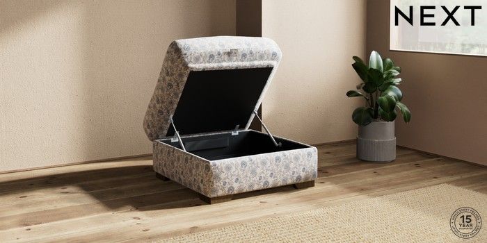 7.3.1 Buy Houghton Deep Relaxed Sit Storage Footstool Relaxed Linen Look Print Woodblock Floral Blue Square Angle - Mid from the Next UK online shop Click here to use our accessible website