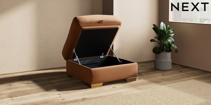 6.12.1 Buy Houghton Deep Relaxed Sit Storage Footstool Ripple Chenille Mid Rust Brown Square Angle - Brushed Brass from the Next UK online shop Click here to use our accessible website