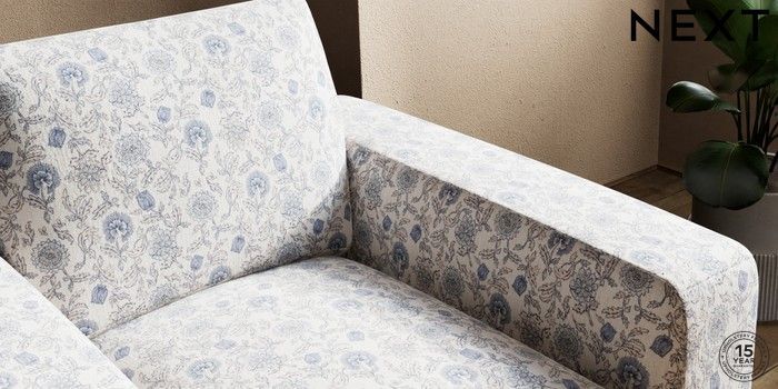 7.3.1 Buy Houghton Deep Sit Armchair Relaxed Linen Look Print Woodblock Floral Blue Large Square Angle - Brushed Brass from the Next UK online shop Click here to use our accessible website