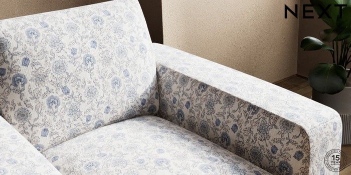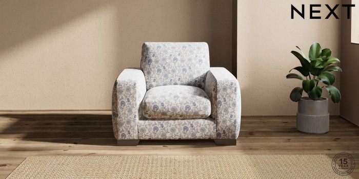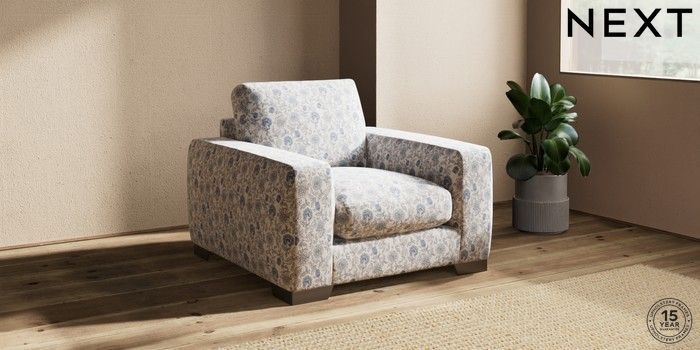 7.3.1 Buy Houghton Deep Sit Armchair Relaxed Linen Look Print Woodblock Floral Blue Large Square Angle - Gunmetal from the Next UK online shop